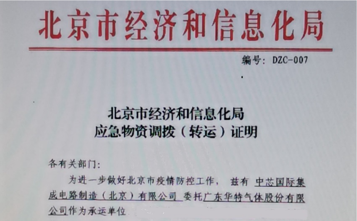 打赢疫情防控的同时,也要打赢经济战。公司还收到北京市经济和信息化局发来的应急保障物资调拨证明,要求公司及时为中芯国际集成电路(北京)有限公司供应配套产品。